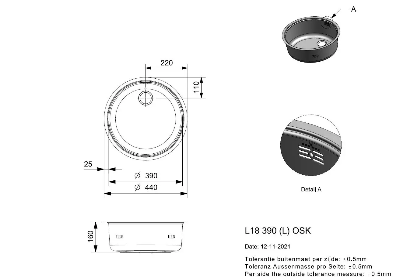 Edelstahl Küchenspüle rund poliert L18 390 OSK