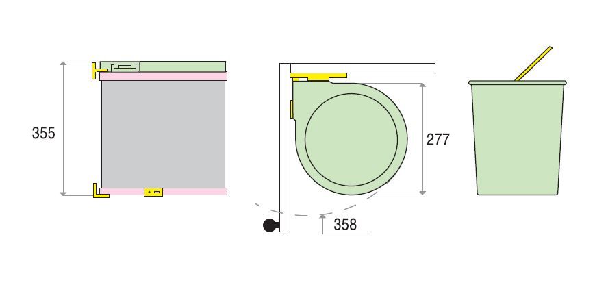 Die Steuerkurve hebt den Deckel des Eimers beim öffnen der Tür automatisch an. Der Abfallsammler kann nach Auslösen aus der Schiene leicht hin und her bewegt werden. So sind Schrankinnentür und Eimer leicht zu reinigen.