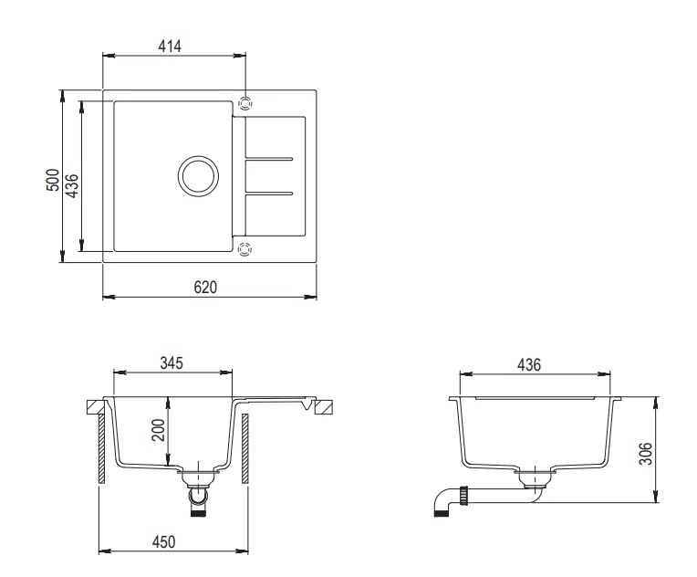 SAturn 620 ist eine Küchenspüle aus Verbundwerkstoff zum Einbau. Das Design ist praktisch und schlicht mit 2 Bohrungen für den Wasserhahn und die Excenterbedienung mit schwarzem Drehknopf. Das Verbundmaterial ist von hoher Qualität, wodurch die Spüle sehr langlebig und leicht zu reinigen ist.Das Waschbecken wird mit einer schwarzen Ablaufgarnitur geliefert.