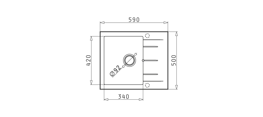 Die Spüle mit Abtropffläche ist massiv und verfügt über vorgebohrte Löcher für Armatur und Excenterbedienung.