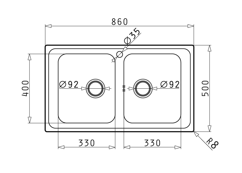 Beckenabmessung: 2x 330 x 400 x 190 mm