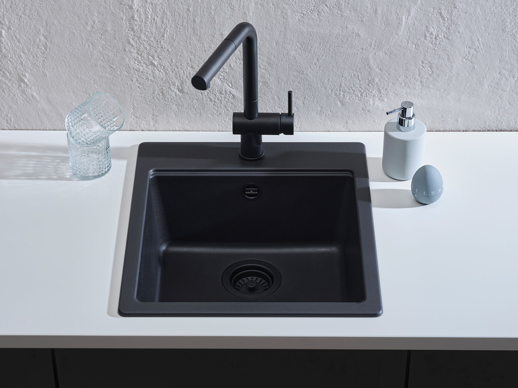 Reginox stellt eine neue Granitlinie vor: die Elite! Die Elite-Spülbecken bestehen aus einer Zusammensetzung aus natürlichem Granit und Acrylharz. Es kommt ein spezielles Verfahren zur Anwendung bei dem vollständig gefärbte Granitpartikel verwendet werden. Dies macht die Spülen zeitlos, langlebig und vielseitig, mit einer besonders hohen Widerstandfähigkeit gegen Stösse und Temperaturschwankungen. Die neue Designspüle ist in der Farbe Nero-Black erhältlich, einem matten schwarz, was tief, rein und intensiv ist.