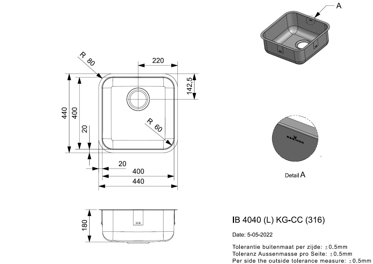 Mit Innenmaßen von 400×400 mm bietet das R23228 trotz kompakter Bauweise viel Platz für den täglichen Einsatz. Der verwendete V4A Edelstahl (316) macht das Becken besonders korrosionsbeständig – ideal, wenn aggressive Reinigungs- oder Desinfektionsmittel zum Einsatz kommen.