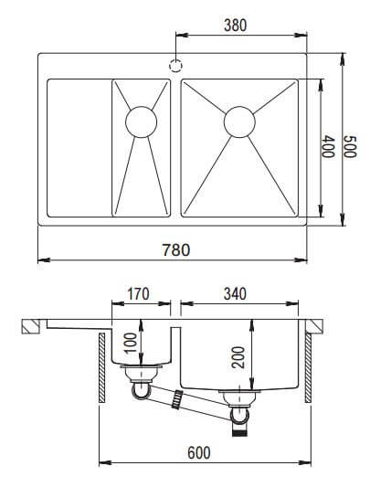 - Beckennmaße: 340/170 x 400 x 200/100 mm (Becken rechts)