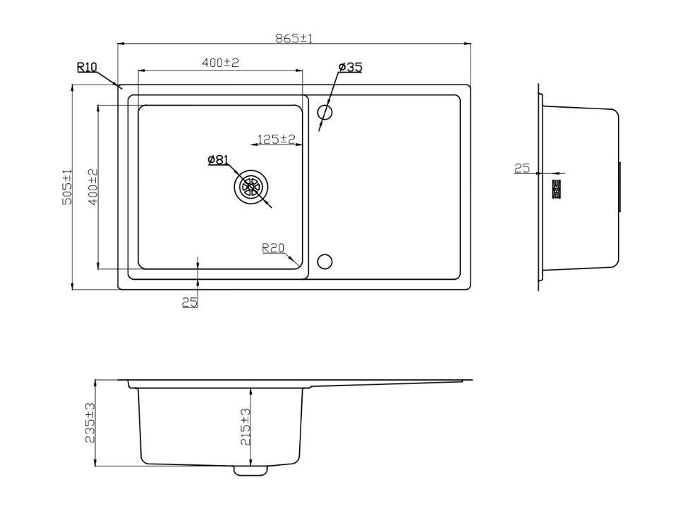 - Beckenmaß: 400 × 400 × 215 mm (extra tiefes Becken)